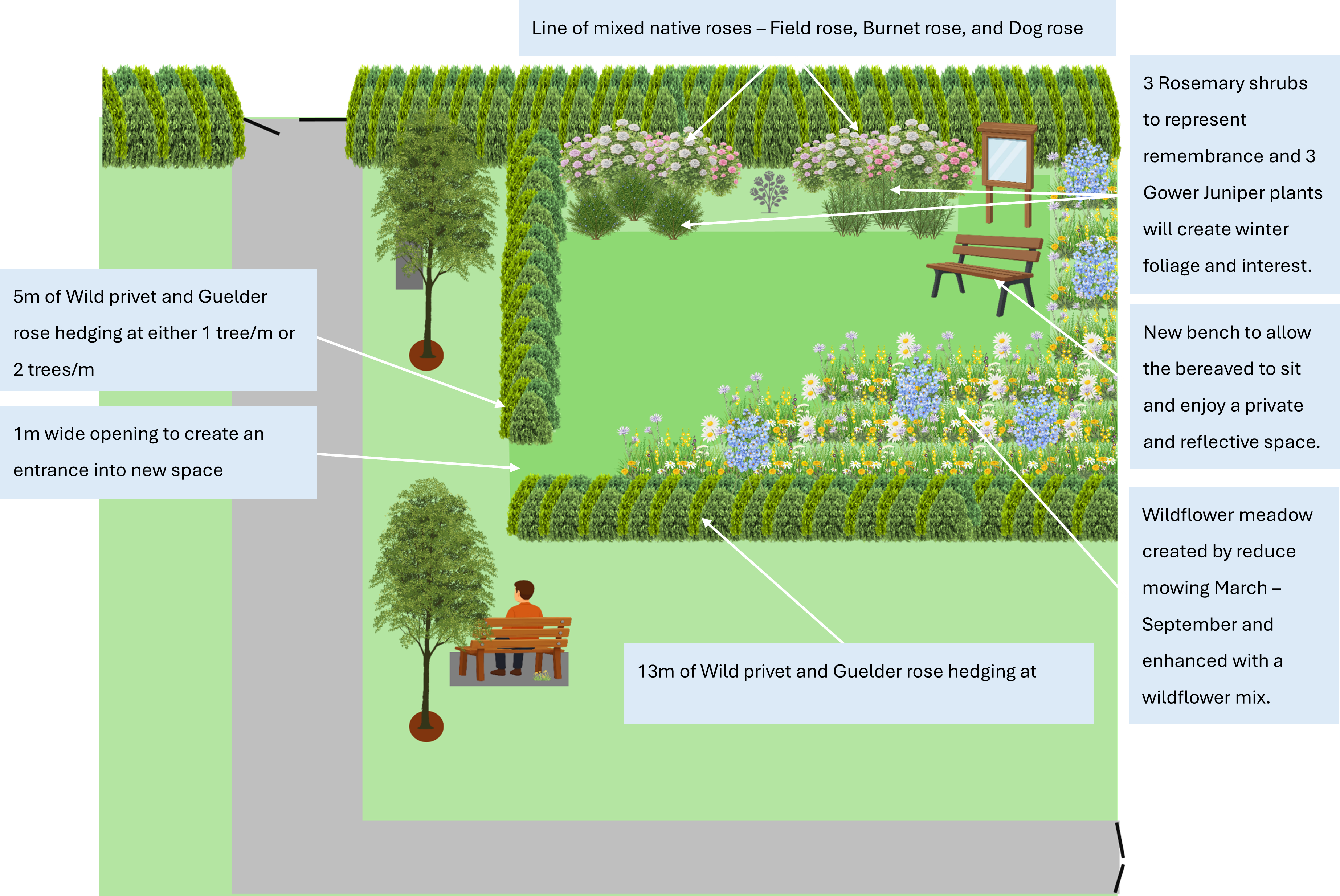 The grassy bank areas have been allowed to develop as wildflower areas, which, in time, will add a pleasant backdrop during visits.